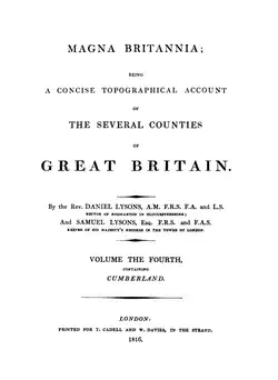 Magna Britannia, being a concise topographical account of the several counties of Great Britain was a topographical and historical survey published by the antiquarians Daniel Lysons and his brother Samuel Lysons in several volumes between 1806 and 1822. It covers the counties of Bedfordshire, Berkshire, Buckinghamshire, Cambridgeshire, Cheshire, Cornwall, Cumberland, Derbyshire, and Devon. The work was curtailed in 1819 on Samuel Lysons' death.