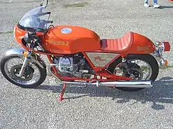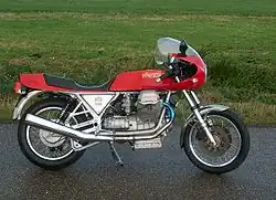 Magni wanted to produce an "all Italian" machine and turned to Moto Guzzi for a supply of engines. The first Guzzi engined machine was the Magni-Guzzi LeMans 1000, using the engine from the Le Mans 1000. A new frame was designed, which had similarities to the Lino Tonti designed Moto Guzzi item. Magni introduced the "parallelogram" rear suspension,[33] previously used on the 1950 shaft drive MV Agusta 500 cc GP machines,[35] which negated the torque reactions of the shaft drive and made the handling more predictable.[30][36] (A parallelogram kit was made available to upgrade the rear suspension of Moto Guzzi models)[37]