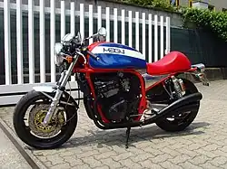 Following the demise of MV Agusta in 1978, Magni turned to Honda for a supply of engines. An agreement to use the 4-cylinder CB900 Bol d'Or engine was made. Two variants were made; the naked MH1 which used Honda forks and wheels and the faired MH2, which used Italian forks, wheels and brakes.[2][30] The exact specification of the machines varied according to the purchaser's requirements. Some had Eckert engine tuning components fitted and produced 120 bhp (90 kW).[31] Around 300 Honda engined machines were made, many being sold in Germany.[4]
