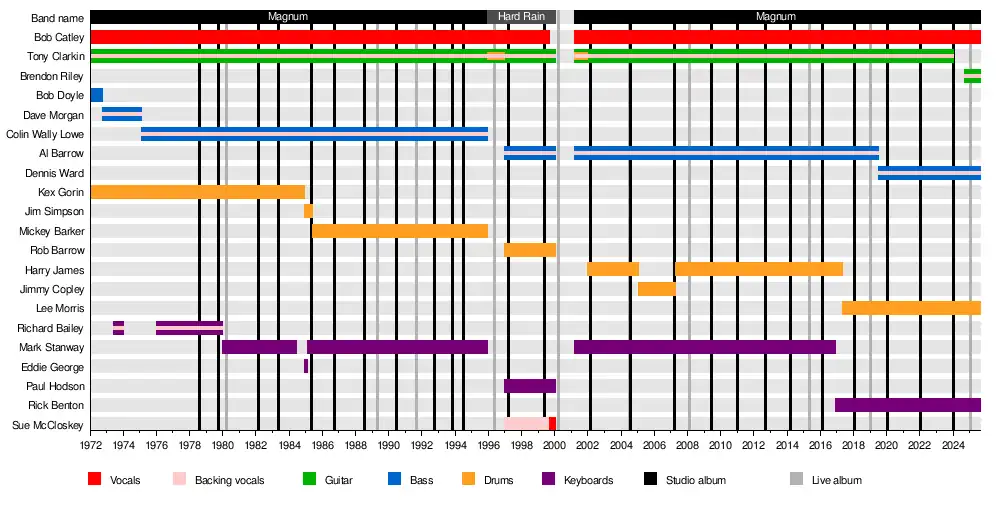 Magnum's roots were in the house band at Birmingham's famous Rum Runner night club (later the home of Duran Duran) in 1972. Joining Clarkin and Catley were drummer Kex Gorin (born Kevin Gorin, 26 January 1949, Birmingham died 21 December 2007) and bassist Bob Doyle. The band line up remained the same until later in 1972, when Les Kitcheridge joined temporarily on rhythm guitar. Clarkin had left the band and it was at this stage that the band was renamed Magnum with Clarkin rejoining thereafter.[5][6] Bob Doyle left Magnum in 1972 and joined Roy Wood's Wizzard, and was replaced by former Uglys and Balls bassist Dave Morgan (later a member of ELO).[7] Richard Bailey joined on keyboards in June 1973, before going on a two-year sabbatical in South Africa the next year.[8]