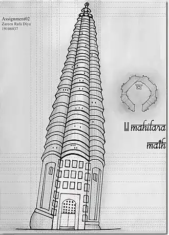 The Math is an octagonal spire type math with repeated curved cornice, built with brick, stucco, and Terracotta patterns.[3] The brick walls have cement-based mortar, while the stucco plaster masonry and stucco roofing add to the temple's physical features. The math is south-facing and rises to a height of about 27.43 m above a 3.84 m high octagonal base. The temple is built on a square base, over one or two drums or, most commonly, an octagonal lower structure. The lower structure is accompanied by four or more miniature spired turrets at the corner, appearing as a "panch-ratna" or "Navaratnam" pattern influenced style.
