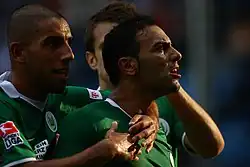 Mahir Sağlık with Ashkan Dejagah and Zvjezdan Misimović celebrating after scoring a goal in the match against VfL Bochum, 24 August 2008.