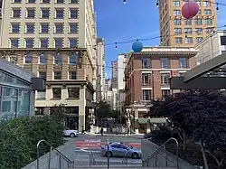 Prior to the 1906 earthquake, the street was called Morton Street and was the center of San Francisco's red-light district. Historically, the street reported one murder a week.[1] The earthquake, which leveled much of the city, rendered this two-block stretch rubble, and the brothels were destroyed.[1][2] It was renamed Maiden Lane by an enterprising jeweler who wanted to conjure the Maiden Lanes of London and New York.[2][3] In 1955, on the initiative of local merchants, cars were prohibited from the lane during certain times of day, an unusual measure at the time.[4]