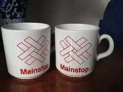 The Mainstop corporate logo illustrated on two promotional coffee mugs.
