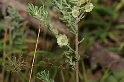 Black cottonbush grows in heavy, seasonally wet, waterlogged soil and is sometimes a coloniser of cleared land. In is found in western New South Wales,[4] mainly along the Murray River floodplain, the mid-west and Melbourne-Bacchus Marsh areas of Victoria,[5] the south-east of South Australia[6] and south-eastern Queensland.[2] It has also been naturalised in the Cape Provinces of South Africa.[11]