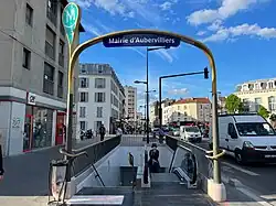 Mairie d'Aubervilliers (French pronunciation: [mɛʁi dobɛʁvilje]) is a station on Line 12 of the Paris Métro, and is the northern terminus of the line. The station is located near Aubervilliers town hall and opened on 31 May 2022. In the future, it will be served by Line 15 of the Grand Paris Express.[2][3]