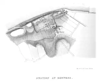 The fort stood on a sea-cliff over 50 feet (15 m) high, rising steeply from the shore, and commanding lower ground in all directions. The name 'Bowness' means 'rounded headland', indicating the good position of the fort, having commanding views of the nearby coastline. It was built over the site of the eightieth milecastle.