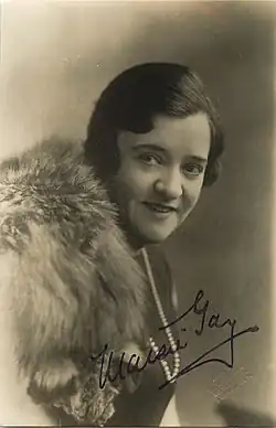Gay first appeared on stage in 1903 as a chorus girl. She soon rose to more prominent roles, and from 1904 to 1907 she toured the British provinces as Nan, the title role in the musical A Country Girl, with a book by James T. Tanner.[1] She made her West End debut in A Waltz King in 1908, and followed that with a role in The Girls of Gottenberg. After a successful run in Tanner's Our Miss Gibbs, Gay toured the United States in another Tanner show, The Quaker Girl. She returned to London to appear in a fourth show with a book by Tanner, The Girl on the Film, in 1913. Gay remained active on the stage in both London and New York, in musicals and revues, during World War I, especially in a US tour of Arthur Hammerstein's High Jinks in 1914 and 1915.[2] She was often in works by Noël Coward, including London Calling! (1923, produced by André Charlot), and This Year of Grace (1928–1929, on tour in Australia).[3]