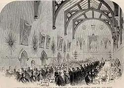 Work then began (in March 1881) on erecting a new grand public hall where the prison had formerly stood. In April of that year, however, William Burges died; his designs, though, were largely complete and the project was completed after his death by his partners, Pullan and Chapple.[3] The new hall, or 'assembly room', was opened by the Duke and Duchess of Connaught on 14 July 1883, and it subsequently came to be known as the Connaught Hall.[1]