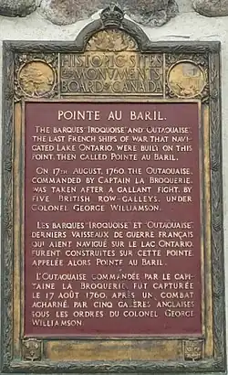 In 1760, the French were forced to leave their fort at Pointe au Baril when British troops invaded. General Amherst captured the fort as well as both ships.[6] The site was left abandoned for around 20 years; the British initially made no attempt to settle initially or colonize the area. By the time the Loyalists arrived, around 1784, there was little to no evidence of the French settlement or fort; all that remained was a log building, which had once been used as officers’ quarters.[6] The approximate site of the fort was designated a National Historic Site of Canada in 1923 and is marked by a stone cairn.[7][8]