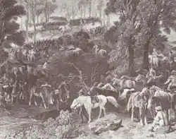 Cunningham's regiment arrived in Ninety-Six on November 19 to support Major Andrew Williamson against a band of Loyalist militia. The battle lasted for three days before the sides agreed to both lay down their arms.[8] However, rebel Colonel Richard Richardson violated the truce, dispatching a fleet of Rangers to surprise a Loyalist party the morning of December 22. In what became known as the Battle of Great Cane Break, the rebels captured 130 men while suffering no casualties. The loyalist group was led by Cunningham's cousin Patrick, who managed to escape into Cherokee country.[9]