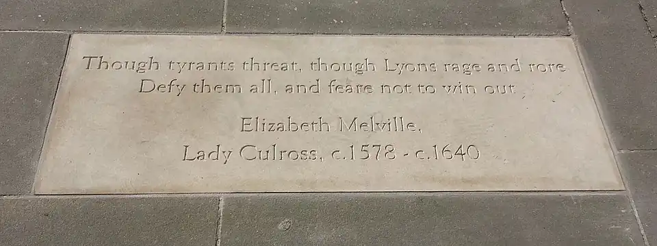 | Elizabeth Melville, Lady Culross | Scots | "Though tyrants threat, though Lyons rage and rore