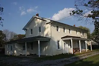 Built in 1752, this historic structure is a two-story, six-bay, stuccoed, stone structure with a gable roof. Its second story was added in 1764; the building was renovated in 1851. The complex also includes the 2+12-story, stuccoed, stone schoolmaster's house that was built in 1787, and a horse shed that was built circa 1800.[2]