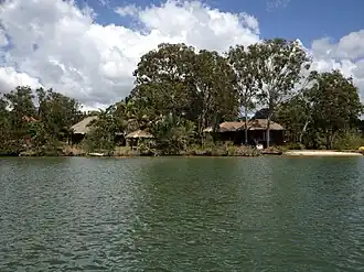 Makepeace Island is a small heart shaped island in the Noosa River in the Shire of Noosa on the Sunshine Coast, Queensland, Australia.[1] The island is currently owned by Virgin Australia (formerly known as Virgin Blue) founding partners, Brett Godfrey and Sir Richard Branson. The island is Sir Richard Branson's Australian home and can hold up to 22 guests accommodated in three 2-bedroom villas and a 4 bedroom Bali House wing. The property has a tennis court, theatre, two-storey Balinese wantilan, 500,000-litre pool and indoor bar and dining area.[2]