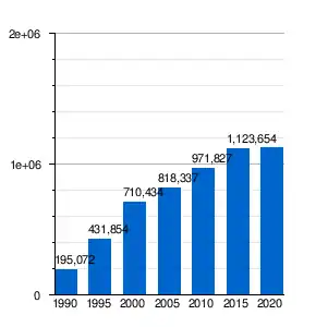 During the 1990s, as Singapore moved to diversify its economy from a manufacturing-based one into a knowledge-based economy, the government relied more on foreign labour to offset Singapore's small local workforce.[17] This resulted in the population of the Malaysian community to increase from a total of 195,072 in 1990, to 431,854 in 1995, a 121% increase within a five year period.[18] By the late 1990s, there were 80,000 employment pass holders and another 450,000 on work permits, with majority being Malaysians, which constitutes 20% of the Singaporean workforce.[17][19]