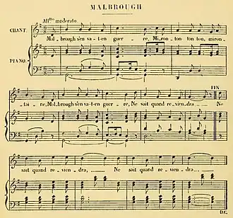 For years it was only known traditionally, and does not appear among the many anecdotic songs printed in France during the middle of the 18th century. Pierre Beaumarchais used the tune in his 1778 play The Marriage of Figaro for a despairing love song for Cherubino.[1][2] In 1780 it became very popular. For instance, the tune concludes a sonata (in D-major) for viola d'amore and viola composed by Carl Stamitz in 1780 while in Paris. And it happened that when Prince Louis-Charles was born in 1785 (son of Louis XVI and Marie Antoinette and heir to the French throne) he was wet-nursed by a peasant named Geneviève Poitrine. The nurse, whilst rocking the royal cradle, sang "Marlborough s'en va-t-en guerre". The name, the simplicity of the words, and the melodiousness of the tune, interested the queen, and she frequently sang it. Everybody repeated it after her, including the king. The song was sung in the state apartments of Versailles, in the kitchens and in the stables – it became immensely popular.[3][4]