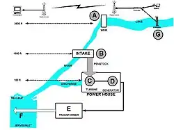A small weir type dam was built at the lake outlet, and, by limiting the discharge into the creek, aids in maintaining the lake level. The weir has a large pipe and valve in its base to pass the minimum 2 cubic feet per second (0.057 m3/s) required to maintain the creek. This is in addition to the water which will be spilled to create power.