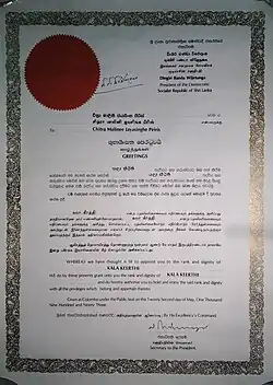 In February 1993, Malinee Peris was honored by the country of her birth when the President of Sri Lanka bestowed on her the title of "Kala Keerthi", the country's highest honor for excellence in the Arts.