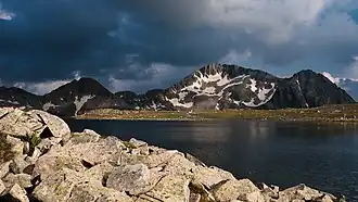 Tevnoto Lake is the largest and northernmost of the group, located in the immediate vicinity of the summits of Momin Dvor and Valyavishki Chukar.[4] It has an elongated curved shape slightly resembling a kidney. Reaching length of 487 m, width of 220 m and area of 62,490 m2, it is the eight largest lake in the mountain range and largest one in Bulgaria above 2,500 m. Its exact altitude is 2,519 m, which makes it the sixteenth highest lake in Pirin. The depth is 3.9 m; the water volume is 116,570 m3.[4][5] The homonymous Tevno Ezero shelter is situated near the out-flowing stream to the south.[4][6] Its natural beauty and majestic surroundings of rugged peaks make it a popular tourist destination.[6]