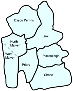 - Chase — named after Malvern Chase — covering much of the adjacent town centre suburb Barnards Green, the extensive Ministry of Defence property occupied by QinetiQ, the campus of The Chase School, the village of Poolbrook, and the largely rural south-eastern area of the adjoining Poolbrook and Malvern commons.