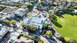 Aerial panorama of Malvern Town Hall intersected by Glenferrie Road and High Street. April 2023.