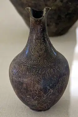 Images were incised on the oinochoe and red filling was pressed into the incisions, some traces of which still remain. This incised decoration suggests the oinochoe comes from the Falisci or Falerii area, but it might also come from the neighbouring settlement of Veii. The incisions depict a warrior who is flanked by a horse on the right and by a goat suckling its kid on the left (both goats missing their fourth leg). Above the goats there were two waterfowl. The engraver equipped the bearded warrior with helmet, greaves and belt and depicted him with his legs spread as if he were dancing.