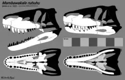 Based on a skull length of 75 cm, Mambawakale would have been a large sized Pseudosuchian of unknown age. Although only the lower edge of the external nares is preserved, it's extent over most of the premaxilla and the front most part of the maxilla suggests they were large in size, comparable to Batrachotomus. The contact between the premaxilla and maxilla is marked by a slight constriction visible when viewing the skull from below and is located within a short toothless section of the jaw (diastema). The surface of the palate shows a series of pits that likely received the teeth of the mandible when the jaw was closed. Each premaxilla contains four teeth, the last of which being notably larger than the first three and more similar to those of the maxilla. This notable heterodonty of the premaxillary teeth is described as an autapomorphy of Mambawakale and differs greatly from most other archosauriforms. The surface of the maxilla, although badly preserved, shows no signs of rugosity and appears smooth. Generally, the maxilla share several characteristics with both Saurosuchus and Prestosuchus. In overall shape the maxilla are straight, diverging from one another as they move away from the premaxilla. The maxilla appear to contain ten teeth each showing little variation in size unlike those of the premaxilla. There is however a slight reduction over the last 4 teeth. The hemimandibles of the lower jaw form an elongated symphisys, which gives the chin a narrow appearance as noted by Charig when naming P. angustimentum. Although at one point considered a derived trait of ornithosuchids, this morphology can also be observed in other groups such as crocodyliforms, poposauroids and phytosaurs. The shallow dentary contains fifteen to sixteen ziphodont teeth.[1] The centrum of the axis in Mambawakale is similar to that of Stagonosuchus, making it a possibility that the two taxa may represent the same species. However, the absence of well preserved postcranial material in Mambawakale and well preserved cranial material in Stagonosuchus makes it impossible to make a definitive statement on the matter. Mambawakale is easily distinguished from both Parringtonia and Nundasuchus and likely does not represent Hypselorhachis or Mandasuchus either.[1]