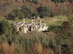 Other features within the estate which are listed include: a sundial in the formal garden to the south of the house;[26] a pool with a fountain in the same garden;[27] the orangery;[28] the terrace walling which runs to the south and east of the house;[29] the steps, with decorative urns, leading from that terrace;[30] and the obelisk, erected by Thomas Balle in 1742 as a guide for shipping, which stands in woodland on a ridge above the house.[31] The writer Christopher Hussey suggests that the orangery was modelled on the water house at Chatsworth and may originally have had a similar cascade.[28]