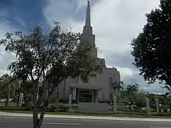 The Manaus Brazil Temple is a temple of the Church of Jesus Christ of Latter-day Saints in Manaus, Amazonas, Brazil.[4] The intent to construct it was announced on May 23, 2007, by the church's First Presidency. It became the sixth in Brazil, and the 138th operating temple worldwide. It was designed by GSBS Architects in collaboration with JCL Arquitetos, having a single spire with a gold-leafed angel Moroni on its top, and the exterior using locally sourced Branco Paris granite. It is on a 7.7-acre site near the Rio Negro and includes two ordinance rooms, two sealing rooms, and a baptistry.