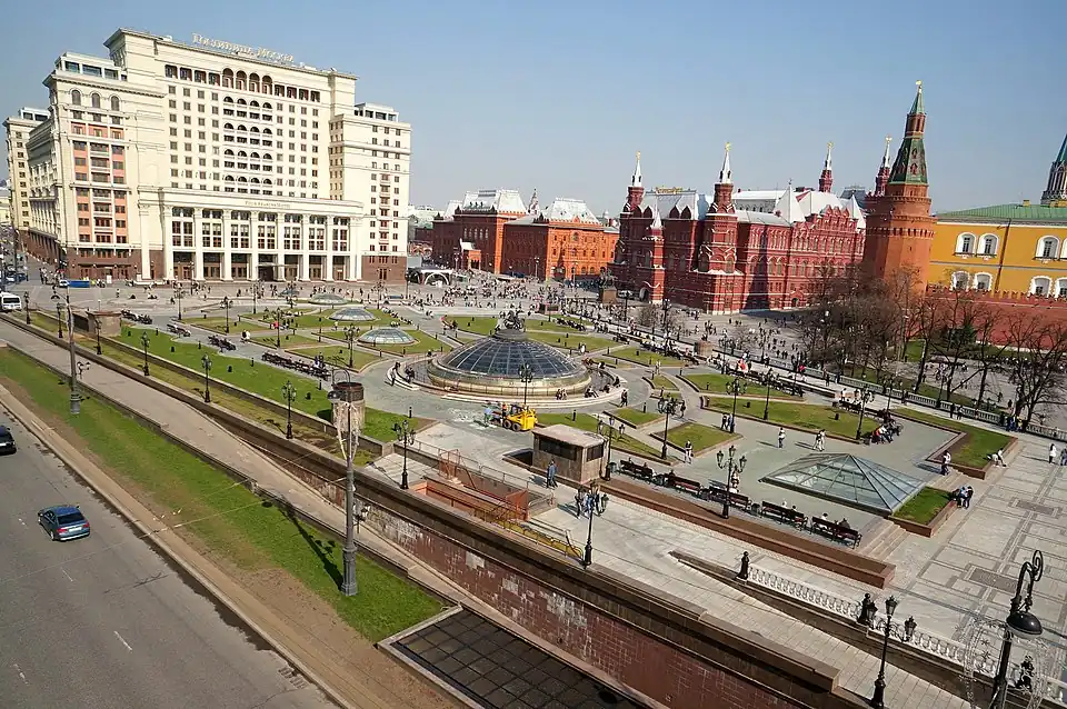 Manezhnaya (Russian: Манежная площадь, IPA: [mɐˈnʲeʐnəjə ˈploɕːɪtʲ], lit.'Manege Square') is a pedestrian open space in the Tverskoy District, at the heart of Moscow. It is bound by the Hotel Moskva to the east, the State Historical Museum and the Alexander Garden to the south, the Moscow Manege to the west, and the 18th-century headquarters of the Moscow State University to the north.