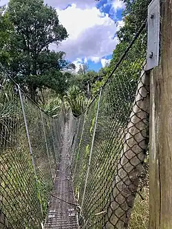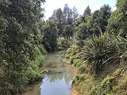 The reserve 18.5 ha (46 acres) of kahikatea forest on the east bank of the river, was purchased by the Native Forests Restoration Trust in 2001. Kahikatea forest once covered 41,000 ha (100,000 acres) in the Waipa Ecological District, now reduced to 158 ha (390 acres), of which 52 ha (130 acres) are in the Mangapu valley, though over 70 ha (170 acres) has been felled since 1975.[11] A major drainage scheme was carried out just upstream from the reserve in the 1930s, including emptying of a lake.[12] The forest floods in winter[13] and flood protection would be uneconomic.[14] Some kahikatea in the reserve are about 120 years old. The reserve also has swamp maire, mataī, tītoki and pukatea.[11] Te Araroa long-distance walkway passes through the reserve and crosses the river on a suspension bridge.[15]