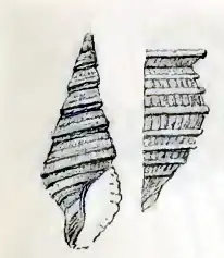 The solid, brownish shell is turriform. The apex is broken off, but 10-11 whorls appear to have existed. These are steeply angulated with a suture impressed below the lowest strongest spiral. Three such spirals are present on the whorls in increasing strength. Another four of decreasing strength show a slightly larger interstice on the body whorl. Between the spiral ribs are fine, extensively extended ribs in the direction of growth, but they become mostly indistinct by a fibrous cuticle.[1]