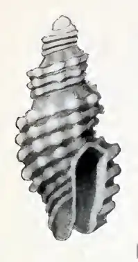 (Original description) The small shell is yellowish white. The 1½ whorls in the protoconch are small, smooth, forming a very small, well-rounded. The apex is white. The subsequent whorls show a very strong sloping shoulder, which is bounded anteriorly by a strong tuberculated spiral cord. In addition to this cord, the whorls are marked by three additional cords, which decrease in strength successively from the strong cord at the shoulder, to the suture. The space between the strong shoulder and the summit of the shell is marked by a strong spiral thread. The base of the body whorl is marked by a peripheral cord, about as strong as the one adjacent to it posteriorly and two others as strong as this, having the same spacing as those on the spire. The columella is provided with four cords, of which the fourth, which marks the anterior limit of the columella, is as strong as the first, while the two intermediate ones are less strongly developed. In addition to the spiral sculpture, the whorls are marked with rounded, low, quite regularly spaced, axial ribs, of which 10 occur upon the first and second, and 14 upon the body whorl . These ribs render the spiral cords tuberculated at their junction with them. In addition, to these strong axial ribs, the entire surface of the shell, between the sutures ami the anterior half of the base, is marked by numerous, quite regular, closely spaced, axial threads, which are best shown in the spaces between the spiral cords and on the tabulated summit of the whorls. The aperture is rather large, scarcely channeled posteriorly. The outer lip is very thick, rendered denticulate on the outside by the spiral cords. The inner lip and the parietal wall are glazed with a thin callus.[1]