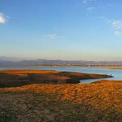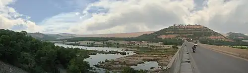 The Mangla Dam (Urdu: منگلا بند) is a multipurpose dam situated on the Jhelum River in Pakistan, lying between the Mirpur district of Azad Kashmir and the Jhelum district of Punjab.[1][3] It is the sixth-largest dam in the world. The fort of Mangla, which sits at the mouth of the dam, serves as its namesake. Construction of the dam began in 1961, with Binnie & Partners, a British engineering firm, announced in November 1961 as the lead designers, engineers, and inspectors for the construction of the dam (led by Geoffrey Binnie). The project was undertaken by a consortium known as the Mangla Dam Contractors,[4] which consisted of eight American construction firms sponsored by the Guy F. Atkinson Company based in South San Francisco, California.[5]