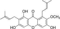 Mangostin and a variety of other xanthonoids from mangosteen have been investigated for biological properties including antioxidant, anti-bacterial, anti-inflammatory, and anticancer activities.[2]