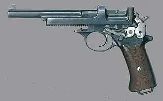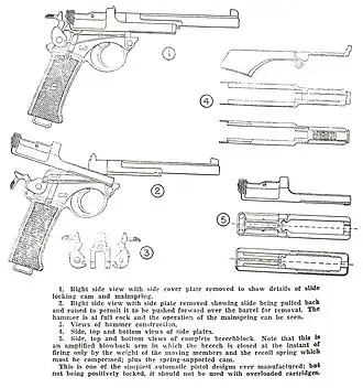 This pistol is one of the most simple of blow-back semi-automatic pistols ever designed. The lockwork is essentially that of an elementary single action revolver. While technically listed as a 'hesitation' lock because of a delaying cam which has some theoretical tendency to slow down the opening of the breech, in actual practice it functions as an unlocked pistol.[1]