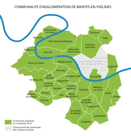 In 2010, Dominique Braye said that the territory of the CAMY would spread in the coming years. In January 2012, thirteen new towns have made their entry into the agglomération.[4] In 2013, five new towns entered the agglomération: Gargenville, Guernes, Fontenay-Mauvoisin, Fontenay-Saint-Père and Saint-Martin-la-Garenne, bringing the number of communes of CAMY to 35.[5] Note that the second city of the metropolitan area, Limay, 16 005 inhabitants, which is also the most industrialized and do not want to join the CAMY. It should, according to the SDCI Yvelines, join Issou and Guitrancourt, common on the right bank of the Seine, to form a new intercommunalité.[6]