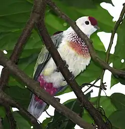 The many-colored fruit dove (Ptilinopus perousii), also known as manuma in the Samoan language, is a species of bird in the family Columbidae.[2][3] It occurs on islands in the south-west Pacific Ocean where it is found in Fiji, the Samoan Islands, and Tonga. Its natural habitat is subtropical or tropical moist lowland forests. Today, the birds are most often found in Fiji and Tonga.[4] It usually feeds high in the canopy on fruit and berries, especially banyan fig. The nest is a small platform of twigs where one white egg is laid.[5]