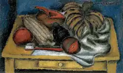 During her time as Diego Rivera's star pupil, he described her artwork as "proud yet modest". Izquierdo's portraits are mature studies in interpretation, they are stylistically very feminine and unmistakably Mexican.[15] In 1937, reviews of her work began to use words like "primitive" and to define her work as primitivist, these comments gained certain regional isolationism.[8] Izquierdo painted a significant number of works with religious themes that fall into a category of imagery, about folk Catholicism or popular art or both.[7] Some representations of popular devotion could be interpreted as religious subjects or as homages to the popular and artisan traditions of Mexico, especially rural Mexico.[7] This category, which is often ambiguous in its intent, is exemplified by María Izquierdo's Calvario (Calvary) of 1933. Izquierdo painted most of her images from memory.[7] Her friend the poet Margarita Michelena recalled that they often went to the country together, and Izquierdo dedicated herself to just looking. Izquierdo evoked memory in her paintings in two ways. First, she used formal means to create a sense of time past. Prior to 1940 she employed loose brushstrokes and avoided detail.[7] Throughout her life she created paintings that lack the directional light and cast shadows that would suggest a specific time of day.[7] Second, after 1940 she portrayed traditional aspects of Mexican culture that were known to be vanishing, such as coscomates (granaries) and altars to the Virgin of Sorrows.[7] The tradition of making Viernes de Dolores altars began to vanish in the 1940s. This is precisely the decade in which Izquierdo painted her series of Viernes de Dolores altars.[7]