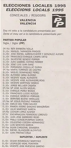 Ballot paper of the Popular Party. Municipality of Valencia local elections of 1995. María José Alcón is listed 16th here.