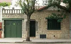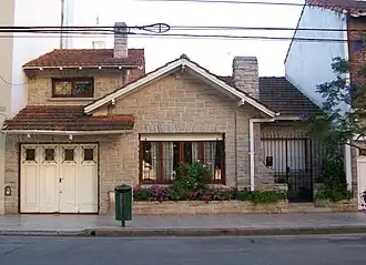 The style is also often associated in Argentina with the californiano ("Californian"), another vernacular type of house close connected with the American Mission Revival style.[4] Mar del Plata style's features, however, are more related to the older Mar del Plata's picturesque architecture, an eclectic style already popular among the upper-class people who used to spend summertime in this resort city between 1885 and 1945,[5] and to the American Craftsman style.[6] The precursor of the style was the Italian-born architectural engineer Alula Baldassarini, who popularized the use of stone on the frontispieces in 1925.[6] Some of these early examples were labeled chalet inglés ("English bungalow"), a type of bungalow or cottage which flourished between 1925 and 1935.[7] Baldassarini also developed a cladding technique known as bastón roto ("'broken stick"), which consisted in rectangular stone bricks irregularly arranged on vertical and horizontal joints.[8]