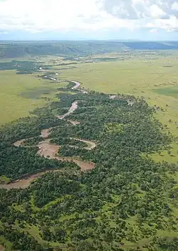The Mara River is a river that begins flowing from Narok County in Kenya and ends in Mara Region in Tanzania. It lies across the migration path of ungulates in the Maasai Mara/Serengeti ecosystem.[1]