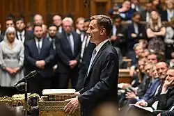 The March 2024 United Kingdom budget was delivered to the House of Commons by Jeremy Hunt, the Chancellor of the Exchequer, on 6 March 2024.[1][2] It was the second budget presented by Hunt since his appointment as Chancellor, the last to be delivered during his tenure as chancellor and the last budget to be presented by the Conservative government of Rishi Sunak before the party was defeated by Labour in the 2024 general election. This is the most recent budget to have been presented by the Conservative party. It was held three weeks after official figures revealed that the country had entered a shallow recession.