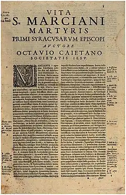 The earliest record of Marcianus, a bishop and martyr with ties to Syracuse, dates back to the second half of the seventh century and is a Kontakion - composed of a poetic homily and a liturgical hymn, like the Akathist in use in the sixth century -[3] attributed to the hymnographer Gregory,[4] although the Jesuit Gaetani had mistakenly attributed it to the Sicilian Joseph the Hymnographer.[5] In the Kontakion Marcianus is presented as: