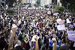 In one of his published books, Feliciano wrote on homosexuals "The rotten feelings of homosexuality leads to hatred, crime, and rejection. We love homosexuals, but we abhor their promiscuous practices." His statements were supported by then fellow federal deputy Jair Bolsonaro.[14] Feliciano was investigated for hate speech for that comment, but was eventually cleared of any wrongdoing. In the closing statements the court said that Feliciano's comments were clearly homophobic and reprehensible, but as no law existed at the time to prosecute homophobia in Brazil, Feliciano could not be formally charged.[15] In August 2013 there was controversy again as there were reports of LGBTQ activists being attacked after a campaign rally by Feliciano in Pará.[16] In an interview for an upcoming book titled Religiões e política; uma análise da atuação dos parlamentares evangélicos sobre direitos das mulheres e LGBTs no Brasil Feliciano claimed that giving women more rights would undermine relationships and marriage, as well as increasing the likelihood that their children would be gay.[17]