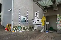 On June 16, protesters participating in the anti-extradition bill march laid flowers at the scene of Leung's death.[35] The organizing group, Civil Human Rights Front, announced that 2 million+1 people joined the march, explaining that the "+1" represented Leung Ling-kit.[36] At the "Lennon Wall" outside the Hong Kong government headquarters on Harcourt Road in Admiralty, citizens posted a photo of his back and a couplet reading, "His heroic spirit for the people will last forever, and his righteous cause will shine through the ages." Every 15 minutes, people bowed three times to Leung's photo and then three times towards Taikoo Place.[37] On June 30, the memorial area outside the government headquarters was vandalized by participants in a pro-police rally.[38]
