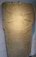 The largest of the Margam Stones, and with the most decorative and figurative carvings, the RCAHMW describe it as "the most impressive of the monuments of this category in the county, if not in all Wales".[12] It has an immense stone wheel-cross with knot-work arcs, plaitwork cross, and a central boss. The shaft includes carved figures flanking the cross, taken to be St John holding his gospel, and the virgin Mary. This is set into a massive stone pedestal block with intricate geometrical patterns and a hunting scene which would originally have formed the front, but was at some point reversed, so is now at the back of the pedestal. Both parts are made from Pennant sandstone and it has been known traditionally as 'The Sanctuary Stone'.[13][14]