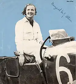 Margaret Mabel Gladys Jennings (née Allan; 26 July 1909 – 21 September 1998)[1] was a Scottish motor racing driver. As Margaret Allan (sometimes erroneously "Allen") she was one of the leading British female racing and rally drivers in the inter-war years,[2] and one of only four women ever to earn a 120 mph badge at the Brooklands circuit.[3] During the war, Jennings worked as an ambulance driver and then at Bletchley Park's intelligence de-coding centre. After the war, she became a journalist and was Vogue magazine's motoring correspondent from 1948 to 1957.