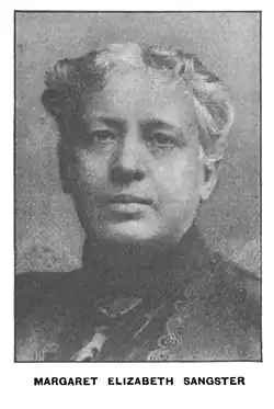 Margaret Elizabeth Sangster (pen name, Aunt Marjorie;[1] February 22, 1838 – June 3, 1912) was an American poet, author, and editor. Her poetry was inspired by family and church themes, and included hymns and sacred texts. She worked in several fields including book reviewing, story writing, and verse making. For a quarter of a century, Sangster was known by the public as a writer, beginning as a writer of verse, and combining later the practical work of a critic and journalist. Much of her writing did not include her name.[2]