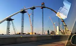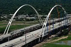 After delays, construction on the bridge began in 2012, costing over $200 million.[4][5] Specifically, the arched pedestrian and bicycle bridges cost $115 million, while the actual freeway bridge was paid for by the state and cost an additional $120 million.[6] The main concrete part of the bridge, which carries I-30 traffic, opened in 2013. The 1,200-foot-long (370 m) steel suspension arches on both sides of the bridge, which also house the pedestrian and bicycle paths, are separate from the concrete part.[7] In April 2014, footings for the arches were constructed, while steel fabrication took place at Tampa Steel Erecting Company's plant in Florida. The superstructure subcontractor to CRC Joint Venture, American Bridge, expected steel components to arrive on site in Dallas during the fall of 2014. The steel arches were completed in 2017, and the entire bridge was planned to open by the end of the year.